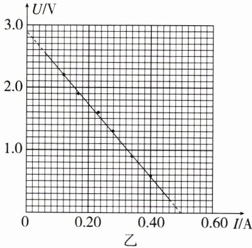 (3) 实验中发现调节滑动变阻器时,电流表读数变化明显但电压表读数变化不明显。为了解决这个问题,在电池组负极和开关之间串联一个阻值为$5\Omega$的电阻,之后该小组得到了几组电压表读数$U$和对应的电流表读数$I$,并作出$U-I$图像,如图乙所示。根据图像可知,电池组的电动势为