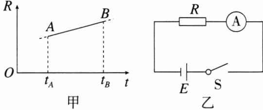 解析 由甲图可知,$t_A$对应的电阻阻值较小,由闭合电路欧姆定律知对应电路中的电流较大,故$t_A$应标在电流较大的刻度上;而$t_B$对应的电阻阻值较大,由闭合电路欧姆定律知对应电路中的电流较小,故$t_B$应标在电流较小的刻度上;由图甲得$R = R_0 + kt$,其中$R_0$为图线的纵截距,由闭合电路欧姆定律得$I = \frac{E}{R + r}$,联立解得$t = \frac{E}{kI}-\frac{R_0 + r}{k}$,可知$t$与$I$是非线性关系,故B项正确,A、C、D三项错误,故选B项。