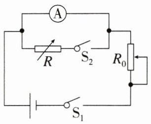 (2) 保持 $ R_0 $ 不变,闭合 $ S_2 $,调节 $ R $,使电流表 $ A $ 读数为 $ \frac{I_0}{2} $;