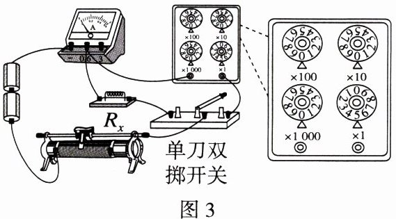 ② 先将单刀双掷开关掷到左边,记录电流表读数,再将单刀双掷开关掷到右边,调节电阻箱的阻值,使电流表的读数与前一次尽量相同,电阻箱的示数如图 3 所示,则待测电阻 $ R_x =$