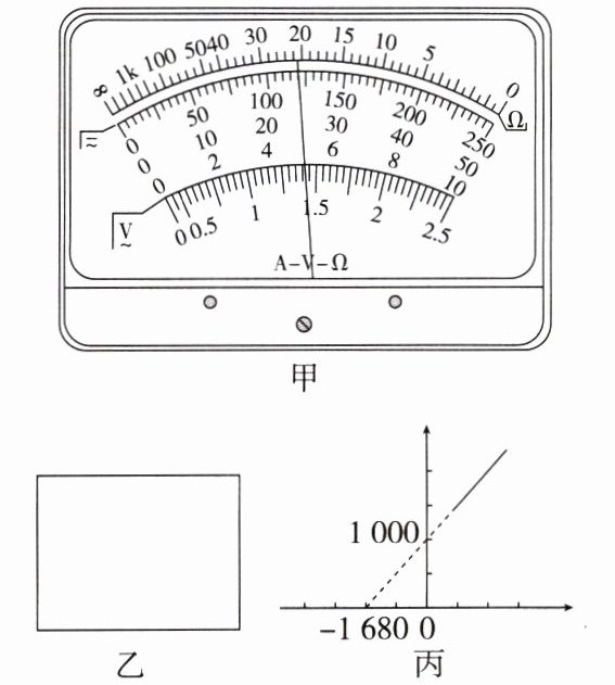 ,为测量水果电池的电动势和内阻,小红再找来一个电阻箱、开关和导线若干,并选择了多用电表的直流电流挡,便开始着手连线测量. 试在图乙方框中画出测量水果电池电动势和内阻的电路图.(2) 小红不断改变电阻箱的阻值,得到多组电阻箱阻值 $ R $ 和电流表的读数 $ I $,通过数据处理,得到如图丙所示的图像.(图像中数据均取国际单位制)由于作图时漏写了横纵坐标表示的物理意义,但记得均在以下六个之中:$ I $,$ I^2 $,$ I^{-1} $,$ R $,$ R^2 $,$ R^{-1} $,请推理得出该水果电池的电动势为