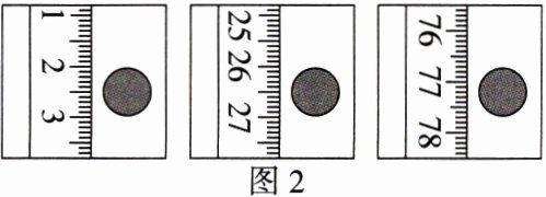 (3) 停止摄像,从视频中截取三帧图片,图片中的小球和刻度如图 $ 2 $ 所示。已知所截取的图片相邻两帧之间的时间间隔为 $ \frac{1}{6} \, s $,刻度尺的分度值是 $ 1 \, mm $,由此测得重力加速度为