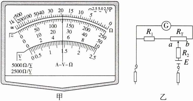 (3) 图乙是某同学设计的多用电表测电阻的欧姆调零原理图,电池的负极应接表笔 (选填“红”或“黑”). 图中 $ G $ 为表头,量程 $ 100 \mu A $,内阻 $ R_{g} = 2.5 \ k\Omega $,$ R_{T} = 0.5 \ k\Omega $,通过调节 $ a $、$ b $ 间的触点,使 $ G $ 满偏. 已知 $ R_{2} = 4.8 \ k\Omega $,电池电动势为 $ 1.50 \ V $ (电池内阻可忽略),触点在 $ a $ 端时 $ G $ 满偏,则 $ R_{1} = $ $ k\Omega $.