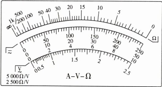 (3) 多用电表的表盘如下图所示,在上面探测 $ A $、$ C $ 两接线柱间电阻时,红表笔接 $ A $ 接线柱,黑表笔接 $ C $ 接线性,这时电流从