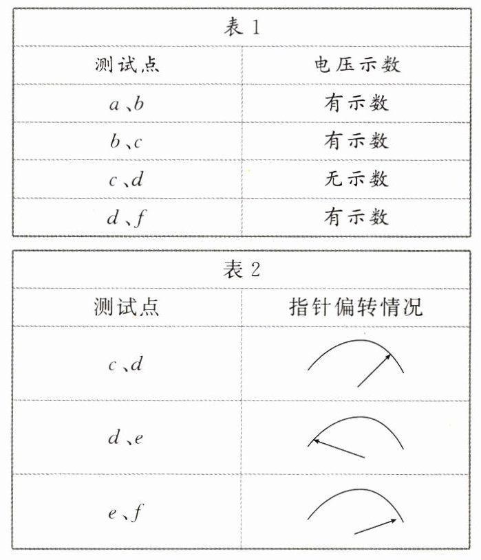 由题给条件无法判断灯A、灯B是否短路,故A、B两项错误;由表1可知,a、b间,b、c间,d、f间均有示数,c、d间无示数,说明d、f之外路段无断路,且d、f间有电压,而灯不亮,则d、f间有断路,故C项错误,D项正确,故选D项.