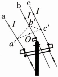 【解析】 如图所示,画出三根导线的截面图,由右手螺旋定则及矢量的叠加规律可知,$c'$点的磁感应强度方向斜向右上方,$b'$点的磁感应强度方向水平向左,A项错误;$a$和$c$导线在$O$处的磁感应强度矢量和为0,$O$点处的磁感应强度即为$b$导线在$O$处的磁感应强度,其大小为$B$,设$b'c'$的长度为$L$,则$b'O$的距离为$\frac{\sqrt{2}}{2}L$,故导线$a$在$b'$处的磁感应强度为$\frac{\sqrt{2}}{2}B$,根据对称性,导线$c$在$b'$处的磁感应强度大小也为$\frac{\sqrt{2}}{2}B$,则$b'$处的磁感应强度大小$B_b = 2 × \frac{\sqrt{2}}{2}B\cos 45° = B$.