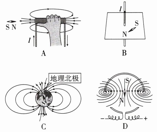 【解析】 根据右手螺旋定则可知,小磁针所在位置磁场方向向左,小磁针的N极应指向左,A项错误;通电直导线周围的磁场分布可以通过右手螺旋定则判断,在图示位置,小磁针N极应指向里,B项错误;地理的北极是地磁的S极,C项错误;通电环形导线内部的磁场分布通过右手螺旋定则判断,图示导线内部的磁场垂直纸面向外,所以小磁针的N极指向外,D项正确.故选D项.