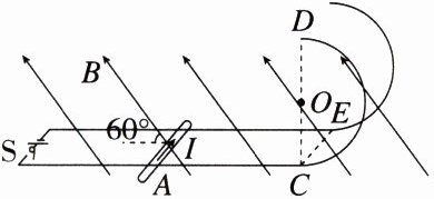 例2 (2023·重庆一模)(多选)如图所示为两条平行的光滑绝缘导轨,左侧与电源相连,其中两导轨的水平部分与半圆部分相切于$C$、$E$两点。现将一导体棒垂直导轨放置,外加匀强磁场,磁场方向垂直于导体棒,与导轨平面的夹角$\theta = 60^{\circ}$斜向左上方。开始时导体棒静止于图中$A$点,当开关$S$闭合后,导体棒由静止开始运动,运动过程中导体棒始终与接触的两条导轨垂直,并恰能到达导轨半圆部分最高点$D$点。已知两导轨的间距$L = 1m$,半圆部分的轨道半径$R = 1m$,磁场的磁感应强度大小$B = 0.5T$,导体棒中的电流$I = 1A$,导体棒的质量$m = 0.05kg$,重力加速度$g$取$10m/s^2$。则下列说法正确的是(