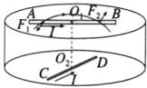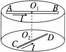 练8 (2023·广东二模)如图所示,一光滑绝缘的圆柱体固定在水平面上。导体棒$AB$可绕过其中点的转轴在圆柱体的上表面内自由转动,导体棒$CD$固定在圆柱体的下底面。开始时,两棒相互垂直并静止,两棒中点$O_1$、$O_2$连线与圆柱体的中轴线重合。现对两棒同时通入图示方向($A$到$B$、$C$到$D$)的电流。下列说法正确的是(