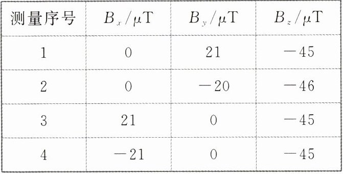 4. (2022·全国乙卷)(多选)安装适当的软件后,利用智能手机中的磁传感器可以测量磁感应强度$B$。如图,在手机上建立直角坐标系,手机显示屏所在平面为$xOy$面。某同学在某地对地磁场进行了四次测量,每次测量时$y$轴指向不同方向而$z$轴正向保持竖直向上。根据表中测量结果可推知(