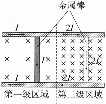 5. (2023·北京)2022年,我国阶段性建成并成功运行了“电磁撬”,创造了大质量电磁推进技术的世界最高速度纪录。一种两级导轨式电磁推进的原理如图所示。两平行长直金属导轨固定在水平面,导轨间垂直安放金属棒。金属棒可沿导轨无摩擦滑行,且始终与导轨接触良好,电流从一导轨流入,经过金属棒,再从另一导轨流回,图中电源未画出。导轨电流在两导轨间产生的磁场可视为匀强磁场,磁感应强度$B$与电流$i$的关系式为$B = ki$($k$为常量)。金属棒被该磁场力推动。当金属棒由第一级区域进入第二级区域时,回路中的电流由$I$变为$2I$。已知两导轨内侧间距为$L$,每一级区域中金属棒被推进的距离均为$s$,金属棒的质量为$m$。求: