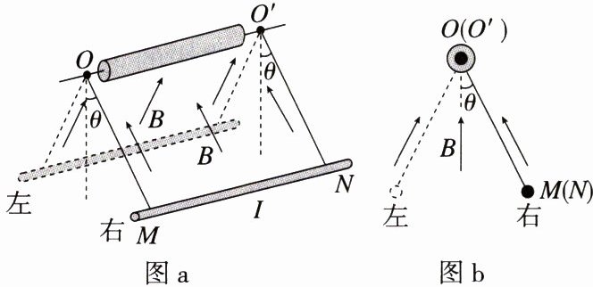3. (2022·湖南)如图$a$,直导线$MN$被两等长且平行的绝缘轻绳悬挂于水平轴$OO'$上,其所在区域存在方向垂直指向$OO'$的磁场,与$OO'$距离相等位置的磁感应强度大小相等且不随时间变化,其截面图如图$b$所示。导线通以电流$I$,静止后,悬线偏离竖直方向的夹角为$\theta$。下列说法正确的是(