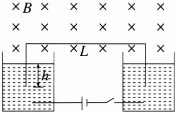 6. (2023·海南)如图所示,$U$形金属杆上边长为$L = 15cm$,质量为$m = 1×10^{-3}kg$,下端插入导电液体中,导电液体连接电源,金属杆所在空间有垂直纸面向里$B = 8×10^{-2}T$的匀强磁场。