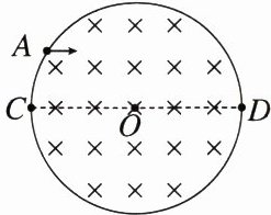 【解析】 由于粒子经过圆心$O$,最后离开磁场,可知,粒子在$A$点所受洛伦兹力向下,根据左手定则,四指指向与速度方向相反,可知,粒子带负电,故A项正确;由于圆形区域半径为$R$,$A$点到$CD$的距离为$\frac{R}{2}$,令粒子圆周运动的半径为$r$,根据几何关系有$r = R$,粒子做匀速圆周运动,由洛伦兹力提供向心力,则有$qv_0B = m\frac{v_0^{2}}{r}$,解得$v_0 = \frac{qBR}{m}$,故B项错误;根据上述,作出运动轨迹,如图所示