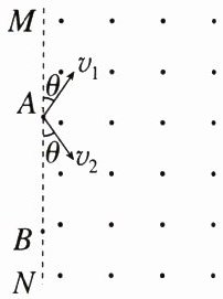 练3(2024·锦州模拟)(多选)如图所示虚线 $ MN $ 右侧有垂直于纸面向外的匀强磁场,两个带同种电荷的带电粒子从虚线上同一点 $ A $ 分别以速率 $ v_1 $、$ v_2 $ 与 $ MN $ 成相同角度 $ \theta $ 垂直磁场方向射入匀强磁场,结果两粒子在边界 $ MN $ 上 $ B $ 点相遇。不考虑粒子间的相互作用力,不计两粒子的重力。则(