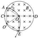 由于圆形区域半径为$R$,$A$点到$CD$的距离为$\frac{R}{2}$,根据上述,粒子圆周运动的半径也为$R$,则$\triangle AOO'$与$\triangle EOO'$均为等边三角形,则轨迹所对应的圆心角为$120^{\circ}$,粒子圆周运动的周期$T = \frac{2\pi r}{v_0} = \frac{2\pi m}{qB}$,则粒子在磁场中运动的时间为$t = \frac{120^{\circ}}{360^{\circ}}T = \frac{2\pi m}{3qB}$,故C项错误;结合上述可知,粒子在磁场中运动的路程为$x = \frac{120^{\circ}}{360^{\circ}} \cdot 2\pi r = \frac{2\pi R}{3}$,故D项正确。故选A、D两项。