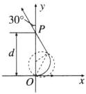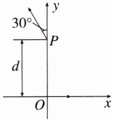 例1(2023·贵州模拟)(多选)一匀强磁场垂直于 $ xOy $ 平面,分布在一个圆形区域内。一个质量为 $ m $、电荷量为 $ q $ 的带电粒子,某时刻经过原点 $ O $,速度大小为 $ v $,方向沿 $ x $ 轴正方向,后来经过 $ y $ 轴上点 $ P $ 时,速度方向与 $ y $ 轴正方向的夹角为 $ 30° $,$ P $ 到 $ O $ 的距离为 $ d $,如图所示。若粒子重力忽略不计,点 $ O $ 在磁场中。则粒子从点 $ O $ 到 $ P $ 的时间 $ t $ 和磁场区域的最小半径 $ R_{min} $ 分别为(