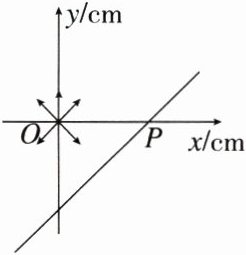 例 1 (2024·四川模拟)如图所示,平面直角坐标系 $xOy$ 内,存在垂直纸面向里的匀强磁场,磁感应强度 $B = 0.2\ T$,原点 $O$ 有一粒子源,能向纸面内各个方向释放出比荷为 $4×10^{8}\ C/kg$ 的正粒子,粒子初速度 $v_{0} = 8×10^{6}\ m/s$,不计粒子重力,有一与 $x$ 轴成 $45^{\circ}$ 角倾斜放置的足够长挡板跨越第一、三、四象限,$P$ 是挡板与 $x$ 轴交点,$OP = 16\sqrt{2}\ cm$,则挡板上被粒子打中的区域长度为(