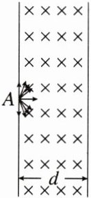 例 2 (2024·湖北模拟)如图所示,垂直纸面向里的有界匀强磁场的宽度为 $d$,在纸面内,相同的带正电的粒子(不计重力)从左边界的 $A$ 点以大小相等的初速度,在 $0^{\circ}~180^{\circ}$ 范围内沿不同方向垂直磁场射入,有些粒子从右边界射出磁场,有些粒子从左边界射出磁场. 已知粒子在磁场中做匀速圆周运动的半径为 $R$,且 $R = d$,圆周运动的周期为 $T$,则下列说法中正确的是(