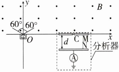 3. (2023·浙江 1 月选考)探究离子源发射速度大小和方向分布的原理如图所示。x 轴上方存在垂直 xOy 平面向外、磁感应强度大小为 B 的匀强磁场。x 轴下方的分析器由两块相距为 d、长度足够的平行金属薄板 M 和 N 组成,其中位于 x 轴的 M 板中心有一小孔 C(孔径忽略不计),N 板连接电流表后接地。位于坐标原点 O 的离子源能发射质量为 m、电荷量为 q 的正离子,其速度方向与 y 轴夹角最大值为 $60^{\circ}$;且各个方向均有速度大小连续分布在 $\frac{1}{2}v_0$ 和 $\sqrt{2}v_0$ 之间的离子射出。已知速度大小为 $v_0$、沿 y 轴正方向射出的离子经磁场偏转后恰好垂直 x 轴射入孔 C。未能射入孔 C 的其他离子被分析器的接地外罩屏蔽(图中没有画出)。不计离子的重力及相互作用,不考虑离子间的碰撞。