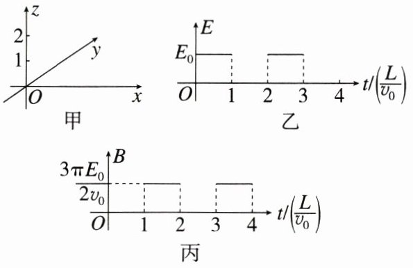 例4 (2024·河北模拟)如图甲所示,在$O - xyz$三维坐标系的空间内有平行$z$轴向上且交替变化的匀强电场、匀强磁场,电场、磁场随时间变化的规律分别如图乙、丙所示,$t = 0$时,一带正电的粒子以初速度$v_0$从$O$点沿$x$轴正方向射入,在$t_1 = \frac{L}{v_0}$时粒子恰经过点$P(L、0、L)$(图中未画出)。已知电场强度大小为$E_0$,磁感应强度大小为$\frac{3\pi E_0}{2v_0}$,粒子重力不计,求: