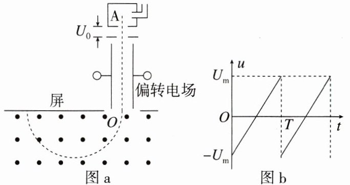 例3 (2024·惠州市模拟)质谱仪可被应用于分离同位素,图a是其简化模型。大量质量$m = 1.60×10^{-27}kg$、电荷量为$q = 1.60×10^{-19}C$的质子,从粒子源$A$下方以近似速度为$0$飘入电势差为$U_0 = 450V$的加速电场中,从中央位置进入平行板电容器。当平行板电容器不加电压时,质子将沿图中虚线从$O$点进入磁感应强度$B = 0.1T$的匀强磁场中,经磁场偏转后打在水平放置的屏上,已知磁场方向垂直于纸面向外,电容器极板长度$L = 6cm$,两极板间宽度$d = 2cm$。现给平行板电容器加上如图b所示的偏转电压,质子在电容器中运动的时间远小于电压变化的周期$T$,水平屏分布在电容器竖直极板两侧,忽略粒子所受重力和粒子间的相互作用力,求: