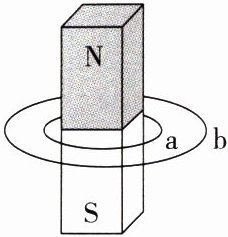 【解析】 根据磁感线的分布情况可知,磁铁内部穿过环面的磁感线方向向上,外部磁感线方向向下.由于磁感线是闭合曲线,磁铁内部的磁感线条数等于磁铁外部磁感线的总条数,而磁铁外部磁感线分布在无限大的空间,所以穿过环面的磁铁外部向下的磁感线将磁铁内部向上的磁感线抵消一部分,a的面积小,抵消较小,则磁通量较大,所以$\Phi_a>\Phi_b$.故选A项。
