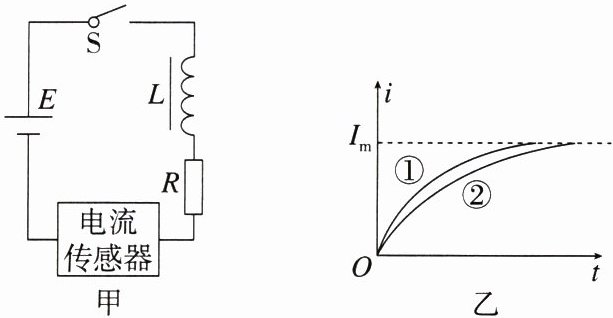 练6(2023·河北模拟)用电流传感器(相当于电流表,其电阻可以忽略不计)研究通电自感现象的电路如图甲所示.电阻的阻值是$R$,线圈$L$中未插入铁芯,电源电动势为$E$,$L$的电阻和电源的内阻均可忽略.闭合开关$S$,传感器记录了电路中电流$i$随时间$t$变化的关系图像,如图乙中曲线①所示.如果改变某一条件,其他条件不变,重复实验,可以得到图乙中曲线②.改变的条件可能是