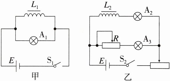 D.图乙中,闭合$S_{2}$瞬间,$L_{2}$中电流与变阻器$R$中电流相等