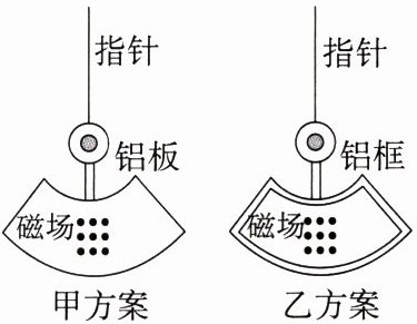 [解析] 甲方案中,铝板摆动时,扇形铝板的半径切割磁感线,即使铝板摆动幅度很小,在铝板内也能形成涡流,起电磁阻尼的作用,指针能很快停下来;乙方案中,当指针偏转角度较小时,铝框中磁通量不变,不能产生感应电流,起不到电磁阻尼的作用,指针不能很快停下,因此甲方案更合理,C项正确,A、B、D三项错误;故选C项。