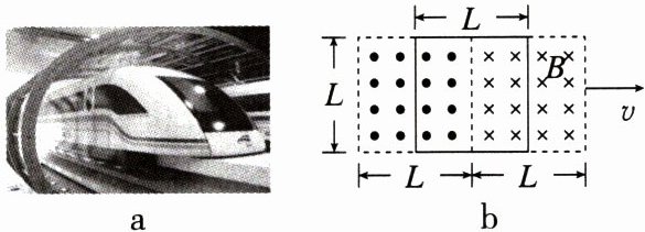 练9(2023·江苏模拟)磁悬浮列车是高速低耗交通工具,如图a所示,它的驱动系统简化为如图b所示的物理模型.固定在列车底部的正方形金属线框的边长为$L$,匝数为$N$,总电阻为$R$;水平面内平行长直导轨间存在磁感应强度均为$B$、方向交互相反、边长均为$L$的正方形组合匀强磁场.当磁场以速度$v$匀速向右移动时,可驱动停在轨道上的列车.在悬浮状态下,列车运动时受到恒定的阻力$f$,则