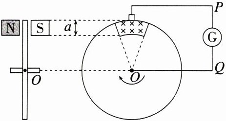 例2(2024·九省联考甘肃卷)1831年,法拉第发明了第一台发电机,示意图如下.半径为$r$的铜盘安装在金属轴上,其边缘置于一个磁铁两极之间的狭缝里,铜盘边缘与轴通过导线与检流计连接.铜盘以周期$T$匀速旋转,检流计中有电流通过.已知狭缝沿半径方向的长度为$a$,狭缝间为匀强磁场,磁感应强度为$B$,忽略狭缝之外的磁场,下列说法正确的是