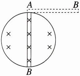 [解析] 导体棒摆到竖直位置时,产生的电动势大小为$E = B\cdot2a\cdot\overline{v}=B\cdot2a\cdot\frac{v + 0}{2}=Bav$,分析可知此时电路相当于金属环左半边和右半边并联后与导体棒串联,两边金属环并联后的电阻为$R_并=\frac{1}{2}×\frac{R}{2}=\frac{R}{4}$,两端的电压为路端电压,有$U_{AB}=\frac{E}{R_并+\frac{R}{2}}\cdot R_并=\frac{1}{3}Bav$。故选A项。