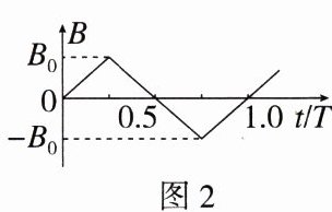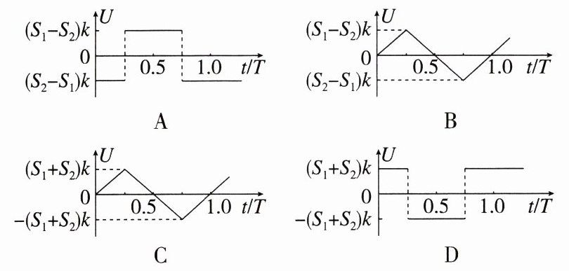 [解析] 由楞次定律可知,圆形线圈内产生的电动势与五角星形线圈内产生的电动势方向相反。所以,整个线圈的“有效面积”为$S = S_1 - S_2$,结合图2,由法拉第电磁感应定律可得线圈内所产生的感应电动势为$e = \frac{\Delta\Phi}{\Delta t} = (S_1 - S_2)k$,因外电路断路且由楞次定律结合图2可知,在$0 \sim \frac{T}{4}$时间内$U_{ab} = -(S_1 - S_2)k$,故选A项。