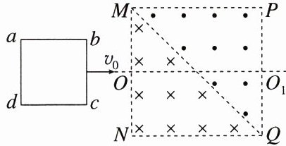 例 4(2023·安徽模拟)如图所示,水平面内边长为$2l$的正方形$MNQP$区域内有磁感应强度大小均为$B$,方向相反的匀强磁场,$O$、$O_{1}$分别为$MN$和$PQ$的中点。一边长为$l$,总电阻为$R$的正方形线框$abcd$,沿直线$OO_{1}$匀速穿过图示的有界匀强磁场,运动过程中$bc$边始终与$MN$边平行,线框平面始终与磁场垂直,正方形线框关于$OO_{1}$直线上下对称。规定电流沿逆时针方向为正,则线框穿过磁场过程中电流$I$随时间$t$变化关系正确的是