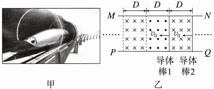 (2022·山东模拟)超级高铁是一种以“真空管道运输”为理论核心设计的交通工具,如图甲所示。其进站的简化图如图乙所示:管道中固定两根平行金属导轨 $ MN $、$ PQ $,两导轨的间距为 $ L $;管道内依次分布磁感应强度为 $ B $,宽度为 $ D $ 的匀强磁场,且相邻的匀强磁场的方向相反;运输车的质量为 $ m $,运输车上固定着间距为 $ D $、与导轨垂直的两根导体棒 1 和 2,导体棒的电阻均为 $ R $,导体棒与金属导轨良好接触。若运输车(两导轨完全处在磁场中)进站的初速度为 $ v_{0} $,不考虑摩擦、空气阻力和其他电阻。求: