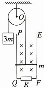如图所示,光滑的定滑轮上绕有轻质柔软细线,线的一端系一质量为 $ 3m $ 的重物,另一端系一质量为 $ m $、电阻为 $ r $ 的金属杆。在竖直平面内有间距为 $ L $ 的足够长的平行金属导轨 $ PQ $、$ EF $,在 $ Q $、$ F $ 之间连接有阻值为 $ R $ 的电阻,其余电阻不计,磁感应强度为 $ B_{0} $ 的匀强磁场与导轨平面垂直,开始时金属杆置于导轨下端 $ QF $ 处,将重物由静止释放,当重物下降 $ h $ 时恰好达到稳定速度而匀速下降。运动过程中金属杆始终与导轨垂直且接触良好,忽略所有摩擦,重力加速度为 $ g $,求: