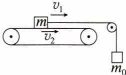 练3(多选)如图所示,水平传送带以速度 $ v_2 $ 顺时针匀速运动,质量为 $ m $ 的物块连接水平轻质细线,绕过光滑滑轮,下端悬挂一质量为 $ m_0 $ 的物体,某时刻物块以速度 $ v_1 $ 向右运动,物块与传送带间的动摩擦因数为 $ \mu $。则关于物块 $ m $ 所受的摩擦力 $ f $,下列说法正确的是(