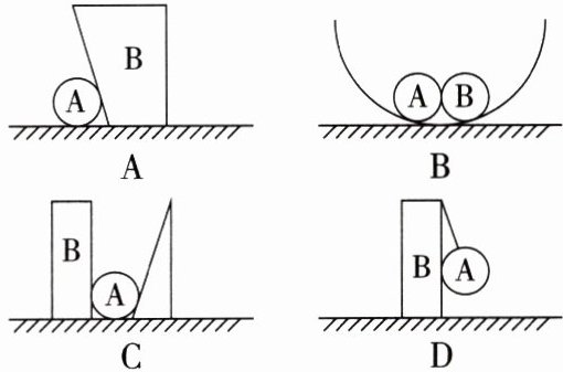 【解析】由图可知B、D两项肯定有弹力,因为A、B间有相互挤压,必定存在弹力。而A项:假设A、B间有弹力,则A、B两物体均不能处于平衡状态,要运动,然而A、B两物体没有运动,故A项A、B间没有弹力;同理C项中,A与B间、A与斜劈间也没有弹力,否则会运动。故选A、C两项。