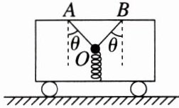 练2(2023·湖南模拟)(多选)如图所示,小车内一根沿竖直方向的轻质弹簧和两根与竖直方向成 $ \theta $ 角的细绳 $ OA $、$ OB $ 拴接一小球。当小车和小球相对静止,一起在水平面上向右运动时,下列说法正确的是(