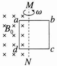练7 (2023·河南模拟)如图,虚线$MN$左侧空间存在垂直纸面向里的匀强磁场,磁感应强度大小为$B_{0}$。与$MN$共面的单匝金属线框$abcd$以$MN$为轴匀速转动,角速度大小为$\omega$。已知正方形线框边长为$L$,回路阻值为$R$,$ad$边与$MN$之间的距离为$\dfrac{L}{3}$,则线框回路中电流的有效值为(