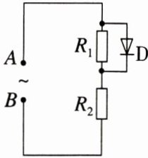 练6 如图所示电路,电阻$R_{1}$与电阻$R_{2}$的阻值都为$R$,理想二极管$D$(正向电阻可看作零,反向电阻可看作无穷大)与$R_{1}$并联,在$A$、$B$间加一正弦交流电压$u = 20\sin(100\pi t)\ V$,则加在$R_{2}$上的电压有效值为(