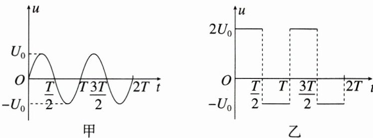 【解析】 由甲图可知,$U_1 = \frac{U_0}{\sqrt{2}} = \frac{\sqrt{2}}{2}U_0$,故A项正确;由乙图知 $\frac{(2U_0)^2}{R} × \frac{T}{2} + \frac{U_0^2}{R} × \frac{T}{2} = \frac{U^2}{R}T$,解得 $U_2 = \frac{\sqrt{10}}{2}U_0$,故B项错误;甲图消耗的电功率为 $P_1 = \frac{U_1^2}{R} = \frac{U_0^2}{2R}$,故C项正确;乙图消耗的电功率为 $P_2 = \frac{U_2^2}{R} = \frac{5U_0^2}{2R}$,所以 $P_1 : P_2 = 1 : 5$,故D项正确。故选A、C、D三项。