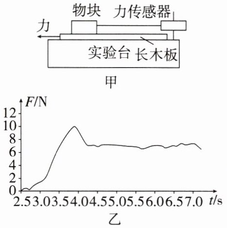 解析为了能研究摩擦力随时间的变化曲线,故物块一直要相对实验台处于静止状态,则向左的摩擦力一直与轻绳向右的拉力平衡,图乙是轻绳向右的拉力随时间变化的曲线,也可以反映摩擦力随时间的变化情况,由图乙可知轻绳的拉力先增大后减小,最后趋于不变,故物块先受静摩擦力作用后受滑动摩擦力作用,所以不需要让木板保持匀速运动,故A、B两项错误;由图乙可知,最大静摩擦力约为10N,滑动摩擦力约为7N,故最大静摩擦力与滑动摩擦力之比约为10:7,故C项正确;根据$F_1 = \mu F_N$,$F_N = mg$可知,由于不知道物块的重力,故无法求物块与木板间的动摩擦因数,故D项错误。故选C项。