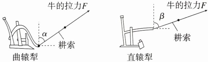 练 3 (2021·广东) 唐代《耒耜经》记载了曲辕犁相对直辕犁的优势之一是起土省力。设牛用大小相等的拉力 $F$ 通过耕索分别拉两种犁,$F$ 与竖直方向的夹角分别为 $\alpha$ 和 $\beta$,$\alpha < \beta$,如图所示,忽略耕索质量,耕地过程中,下列说法正确的是(