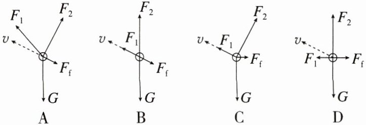 【解析】 由题意可知战机所受重力G竖直向下,空气阻力$F_i$与速度方向相反,升力$F_2$与速度方向垂直,发动机推力$F_1$的方向沿喷口的反方向,对比图中选项可知只有A项符合题意.故选A项.