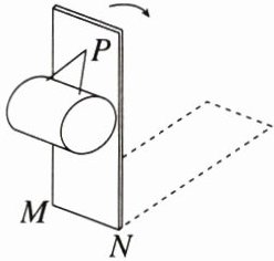 4. (2022·河北)如图,用两根等长的细绳将一匀质圆柱体悬挂在竖直木板的 $P$ 点,将木板以底边 $MN$ 为轴向后方缓慢转动直至水平,绳与木板之间的夹角保持不变,忽略圆柱体与木板之间的摩擦,在转动过程中(