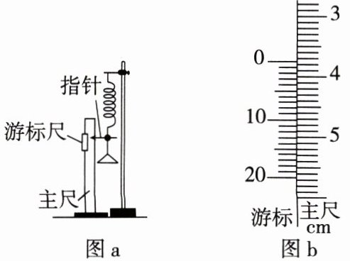 现要测量图 a 中弹簧的劲度系数。当托盘内没有砝码时,移动游标,使其零刻度线对准指针,此时标尺读数为 $ 1.950 $ cm;当托盘内放有质量为 $ 0.100 $ kg 的砝码时,移动游标,再次使其零刻度线对准指针,标尺示数如图 b 示数,其读数为