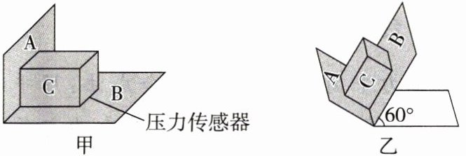 (1)平板 $ B $ 置于水平面上,压力传感器固定在平板 $ B $ 上,将木块 $ C $ 置于压力传感器正上方,木块 $ C $ 紧靠平板 $ A $,如图甲所示,记录此时传感器的示数 $ F_{1} $,此时平板 $ A $ 对木块 $ C $ 的弹力为