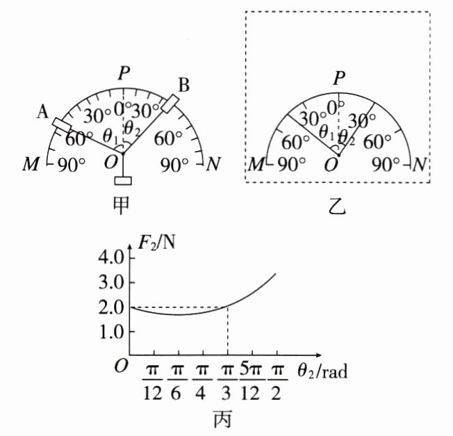 (2)该组同学在实验中,将传感器 $ A $ 固定在某位置后,再将传感器 $ B $ 从竖直位置的 $ P $ 点缓慢顺时针旋转,得到了一系列传感器 $ B $ 的示数 $ F_{2} $ 和对应的角度 $ \theta_{2} $,作出了如图丙所示的 $ F_{2}-\theta_{2} $ 图像,由图丙可知传感器 $ A $ 所处位置的角度 $ \theta_{1} = $